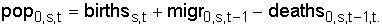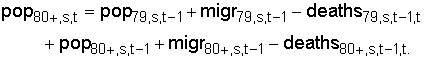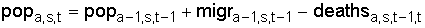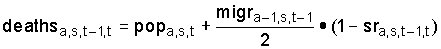 where deaths a,s,t-1,t is deaths occurring as people age from age group a-1 at time t-1 to age a at time t, pop a,s,t is the population of age group a and sex s at time t, migr a-1,s,t-1 is the net number of migrants of age group a-1 and sex s at time t-1, and sr is the survival ratio or proportion of age group a-1 and sex s at time t-1 that survives to age group a at time t.