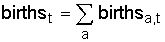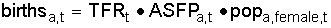 where births a,t is the number of births to women at age a, TFR t is the total fertility rate at time t, and ASFP a,t is the proportion of lifetime fertility that takes place at age a. Total births are found by summing births to women in all the reproductive ages