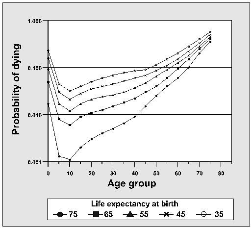 The mortality input in DemProj, life expectancy at birth, indicates overall mortality in a population. But DemProj also needs the pattern of mortality in order to produce mortality rates by age group. These patterns are given by two sets of model life tables: the Coale-Demeny model tables which apply to Europe and other industrialized regions, and the United Nations tables for developing countries (very specific regions). An example pattern (Coale-Demeny West model table) is given in Figure 1. The most appropriate model life table will be the one that most closely matches the crude death rate (CDR) and infant mortality rate (IMR) for that country or region.