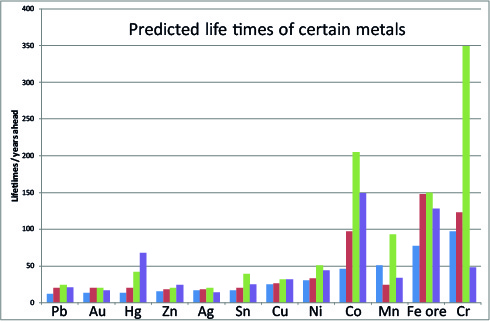 Exercise 5: Figure 2 demonstrates that the predicted lifetimes for various reserves have changed considerably from 1970 to 2005. As example, according to the 1970 predictions metals like lead, gold, mercury, zinc, silver, tin and copper should have been depleted before the year 2000, clearly this is not the case. Considering Figure 2 and the exercises you just performed yourself, answer the following questions.