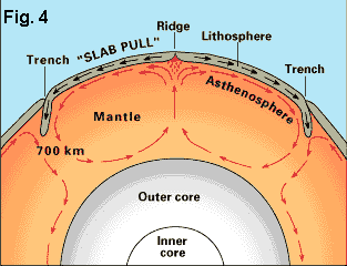 The plates constantly move around on the underlying "hot, weak" asthenosphere. Because the Earth's interior is still hot, and even though the mantle beneath the lithosphere is mostly solid, it is ductile or moldable. It can flow or "creep" driven by convection forces. It are these large convection cells within the Earth's mantle that drag the overlying plates along (Fig. 4). The movement of plates is at a rate of a few centimeters per year.