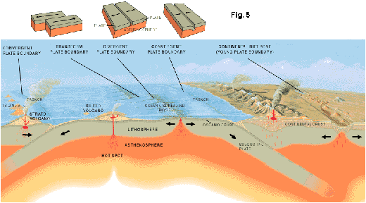 The plates are bordered by divergent, convergent, and transform fault boundaries (see Fig. 5).