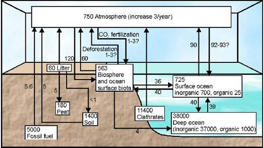 Figure 9. Box model for the global carbon cycle. Each box represents a different reservoir; the numbers indicate the mass of carbon, in billions of metric tons, in that reservoir. Arrows and numbers between boxes represent exchanges (flows and fluxes) of carbon in billions of metric tons per year.