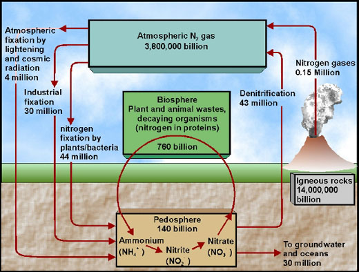The nitrogen cycle (Fig. 12), the continuous flow of nitrogen through the atmosphere, biosphere and pedosphere, is as essential to life as are the carbon and hydrological cycles. Because nitrogen is a key ingredient in proteins, DNA and RNA, life is limited by the amount of available nitrogen. Although nitrogen is the most abundant element in the atmosphere (79 percent by volume), it is an inert gas, and only a few organisms are able to use it directly. A few types of soil bacteria are able to fix atmospheric nitrogen. Usually they live symbiotically with higher plants feeding off the sugars made by plant, while breaking apart nitrogen molecules for plant use. As organisms die, their protein molecules and the nitrogen they contain become available to other soil microbes who convert this to ammonium, nitrite and nitrate, all of which are usable plant nutrients. A part of these nutrients is taken up by groundwater and flows to the ocean, while another part is recycled to the atmosphere by denitrification (conversion of organic nitrates into gaseous nitrogen).