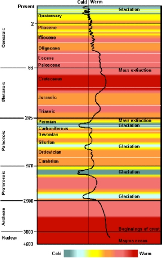 The Earth has undergone dramatic changes throughout its history. The conditions that surround us today are the result of those changes, and the future is governed by the same physical principles that governed the past. Foremost among the factors that have influenced our planet is temperature. Variation in global temperature (Fig. 2) have been controlled by numerous influences, each of which has been dominant in the past. These influences include the Earth's orbital parameters (recall Milankovitch Cycles - System Earth Course), Earth's internal temperature, the evolution of plants, the configuration of continents, and sudden catastrophic disturbances (e.g. meteorite impacts, volcanic eruptions).