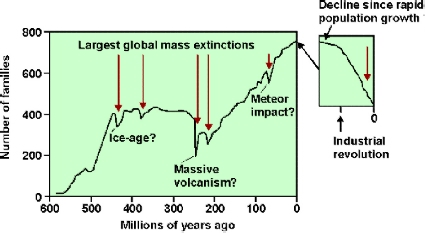 Figure 15. Fluctuation in the estimated number of families (groups of related species) of marine organisms. Arrows point to the five largest global mass extinctions. The general trend has been towards greater biological diversity until present, but a sixth major decrease in number of species is occurring now, as a result of human activity. The strong increase in species since ~200 million years ago is generally believed to be a result of the break-up of Pangea, it created diverse new environments, including extensive nearshore areas that provide rich habitats.