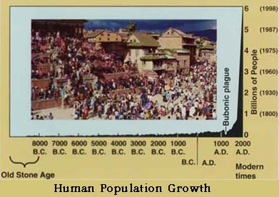 As global population has surpassed 6 billion, concern is mounting over how many more people will be added in the future. Human population growth has been nearly impossible to predict accurately (Fig. 18) because it depends on a bewildering array of variables, from advances in agriculture, sanitation, and medicine to the influences of culture, religion, and medical practices. The rate of human population increase has varied throughout human history, but its most striking feature is an accelerated increase in the last few hundred years. One of the greatest shortcomings of the human species is its unwillingness to face the consequences of accelerating population growth.