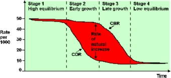 Figure 19. Diagram illustration ofthe four stages of the Demographic Transition Theory (CDR = crude death rate, CBR = crude birth rate).