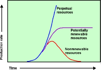 Figure 21. As demand for a resource increases, more of it is produced. For nonrenewable resources, production cannot increase forever, because ultimately the resource will be exhausted. Potentially renewable resources can provide lasting supplies if the rate of production is similar to the rate of renewal. Only for perpetual resources is unlimited increase in production possible.