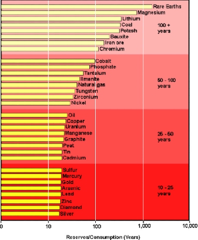 Figure 22 shows the reserves for a number of nonrenewable resources and their time before depletion, estimated using values for production and consumption rates of 1992. With world population and the standard of living increasing rapidly, the time periods obtained using the 1992 consumption rates are almost certainly overly optimistic, however, possibly by a factor of two to three. In other words, we have only a decade or so before reserves for many mineral commodities will be exhausted.