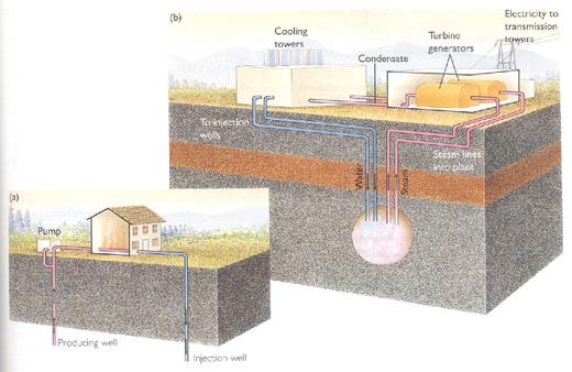 Figure 2. Hydrothermal reservoirs in areas with a high geothermal gradient. a) Shallow, low temperature system for domestic heating. b) Generation of electricity using deep-seated, high temperature steam (>180oC) to drive turbines. Condensed water is reinjected.
