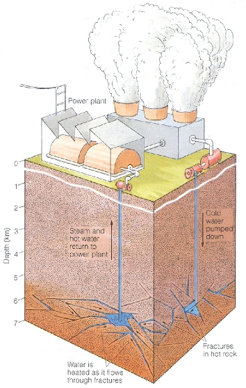 Figure 3. Geothermal energy extraction from hot, dry, crystalline rock at depth (5-7 km). Cold water is pumped through induced fractures at the well-bottom and steam is retrieved and used to generate electricity via turbines.