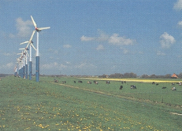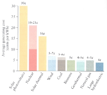 Uneven solar heating of the Earth generates winds, which have long been used to drive windmills. At present,wind energy is mostly used to generate electricity via wind turbines- the modern windmill! Worldwide, around 25 000 installations generate some 3 GW of electric power at a cost which is becoming competitive with coal-based generation (Figure 5). The main advantage is the low environmental impact. However, windmill farms consume large spaces, pose a risk to bird life, generate considerable noise and pose an eyesore, so that public acceptance of large-scale use is questionable. Most importantly, wind power requires consistent wind speeds (> 20 km/hr). Suitable surface winds are only locally available and can provide only ~10% of present energy usage. Wind energy may therefore be locally important (e.g. Denmark, Netherlands,windpumps in developing countries), but not globally.