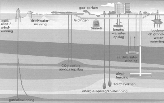 Figure 6. Typical examples of undergroundspace utilization, as envisaged by the Netherlands Institute of Applied Geosciences (NITG-TNO) in Utrecht. Note the gas/oil production from deep reservoirs (Dutch: gas/olie winning), energy storage in solution-mined cavities (zout cavernen) in salt domes (energie opslag / zout winning), waste disposal in clay formations (afvalberging), CO2 disposal and/or natural gas storage in reservoirs and aquifers (CO2 / aardgas-opslag), geothermal energy extraction (aardwarmtewinning), cold/hot water storage (koud / warm water opslag), and underground infrastructure.