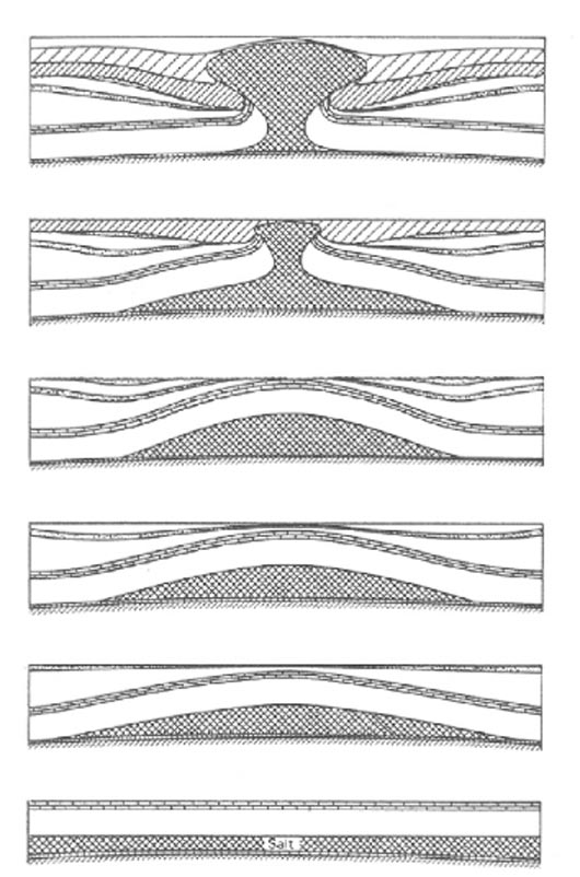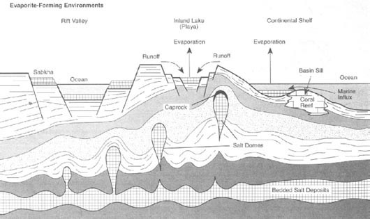 Figure 7. Schematic illustration of theformation of rocksalt by sea-water evaporation in restricted marine environments. Note also the salt tectonic features (salt domes or diapirs) developed as a result of the mobility and low density of (ancient) rocksalt layers buried deep in the geological succession.