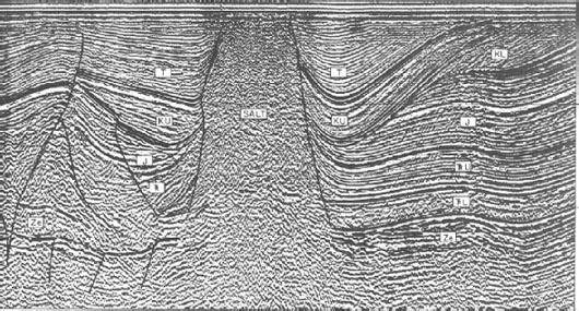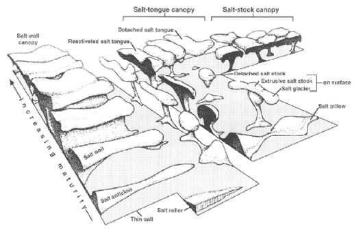 Figure 8. Illustration of salt tectonic features formed as a result of the low resistance of salt to plastic flow, and its low density (buouyancy) compared with other crustal rocks. top) Diapirism or dome formation, as a result of gravitational instability. center) The full spectrum of salt structures formed in salt provinces such as the Gulf of Mexico or N. European Zechstein Basin. bottom) Seismic section showing N.Sea salt dome and associated structures; these form traps for oil and gas.