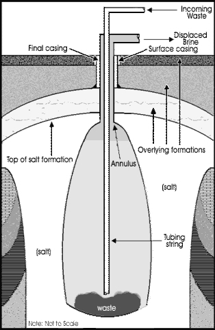 The latter method involves injecting fluid at a pressure just below the rock pressure at the top of the solution mined salt cavern. This minimizes the difference in rock and fluid pressure over the entire height of the cavern and accordingly minimizes the rate of cavern convergence via creep of the rocksalt. Nonetheless, the cavern will slowly converge from the base, pushing the fluid pressure up in the long term. When this reaches the rock pressure at the cavern roof, the roof may tend to leak with convergence squeezing the fluid slowly out. On the other hand, field evidence indicates that risks are small. Research is in progress to examine whether caverns can be safely sealed and abandoned or must be monitored. Similar arguments apply for hydrocarbons storage in salt, though such sites would generally be monitored continuously.