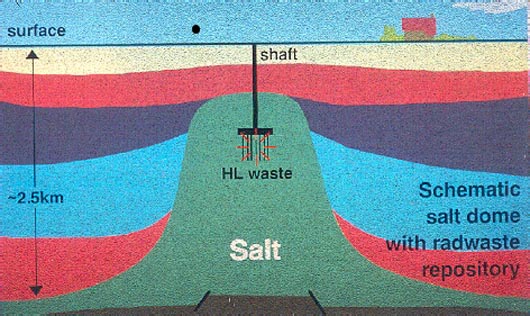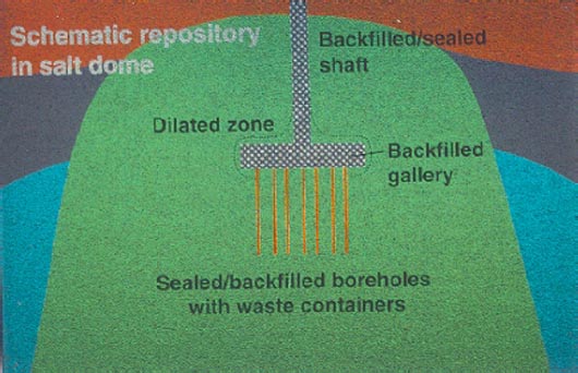 Rocksalt has been considered by numerous countries including the U.S., Canada, the Netherlands, Germany, Spain, and France. Most HLW disposal concepts are based on the notion of a conventionally mined repository, sited in a deep salt layer, pillow or dome (Figure 13). Some concepts focus on permanent disposal, some allow for (temporary) wasteform retrievability. In the case of permanent disposal, galleries and shafts would be backfilled with crushed salt, which would become compacted to the virgin, low porosity/permeability state of intact saltrock by creep convergence of the openings. Detailed numerical modelling studies show that the local heating effect of HLW disposed of in this way would cause only elastic and plastic flow of the surrounding salt, with no fracturing, so that a high degree of isolation is achieved. This has been confirmed by studies at various underground laboratories sited in salt, such as the Asse Mine at Remlingen in Germany.