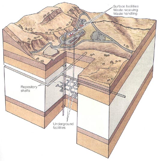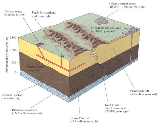 There, a near horizontally bedded, low-permeability tuff formation (Paintbrush Tuff), extending from the surface to a depth of about 500 m, offers the possibility to construct a mined repository at a depth of about 300 m (Figure 14). The tuff is located some 250 m above the water table and is therefore dry. It also contains zeolites, which can absorb a wide range of ions, should a leak occur. The tuffs were ejected some 8 million years ago from a now extinct volcanic center. They are cut by several minor volcanic pipes and by a large normal fault. However, radiometric and stratigraphic (relative) dating methods have shown that there has been no volcanism or fault motion in the last 10 000 to 20000 years, and the probability of such events in the coming 10000 years is considered low. Nonetheless, this question remains controversial, as does the question of the impact of possible climatic change on the water table and on erosion. Site assessment is likely to be completed by 2002 at a total cost of around $7billion.